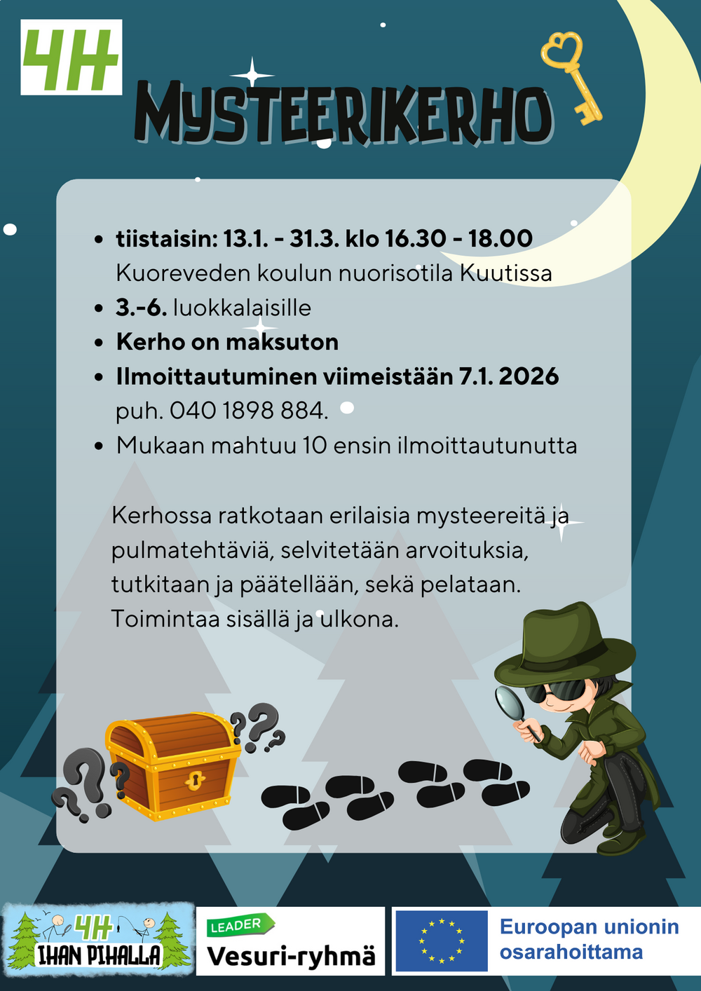 Mysteerikerho jatkaa tiistaisin 13.1. - 31.3.2026 klo 16.30 - 18.00 nuorisotila Kuutissa arvoitusten ja mysteerien äärellä. Toimintaa sekä sisällä että ulkona. Mysteerikerhoon paikkoja vielä vapaana!…