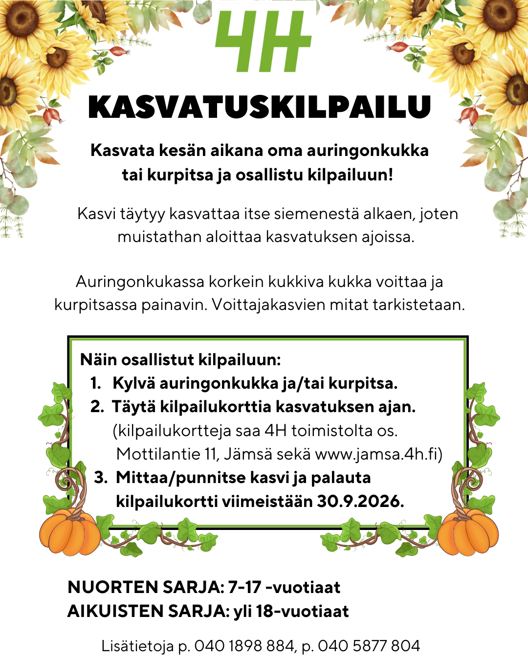 Kasvata kesän aikana oma auringonkukka ja/tai kurpitsa ja osallistu kilpailuun! Lapsille ja aikuisille on omat sarjat. Auringonkukassa korkein kukkiva kukka voittaa ja kurpitsassa painavin.…