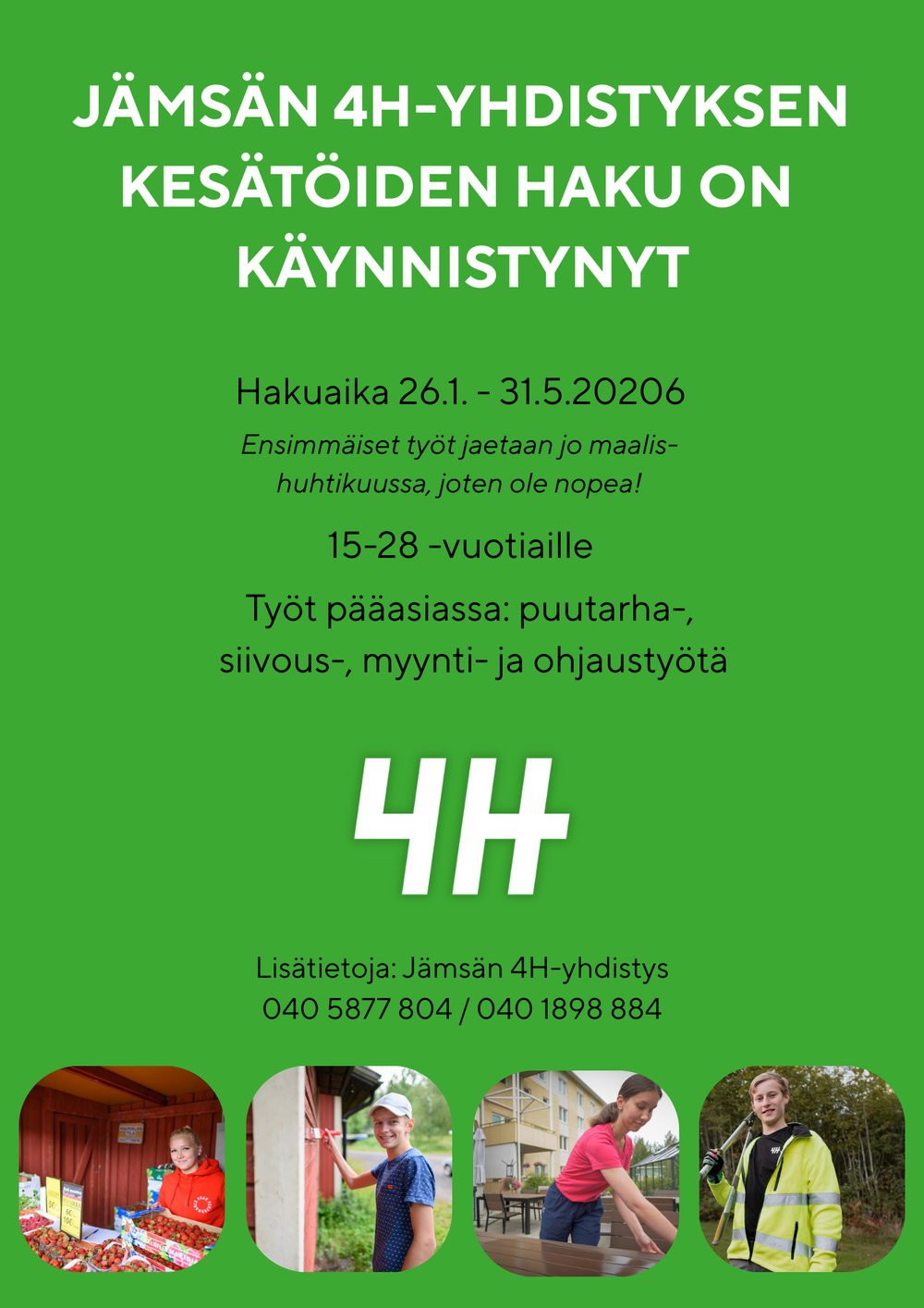 Vasemmalta löydät tietoa työllistämisvaihtoehdoista, tärkeää tietoa työelämästä sekä 4H-yrityksistä, jotka toimivat Jämsässä.