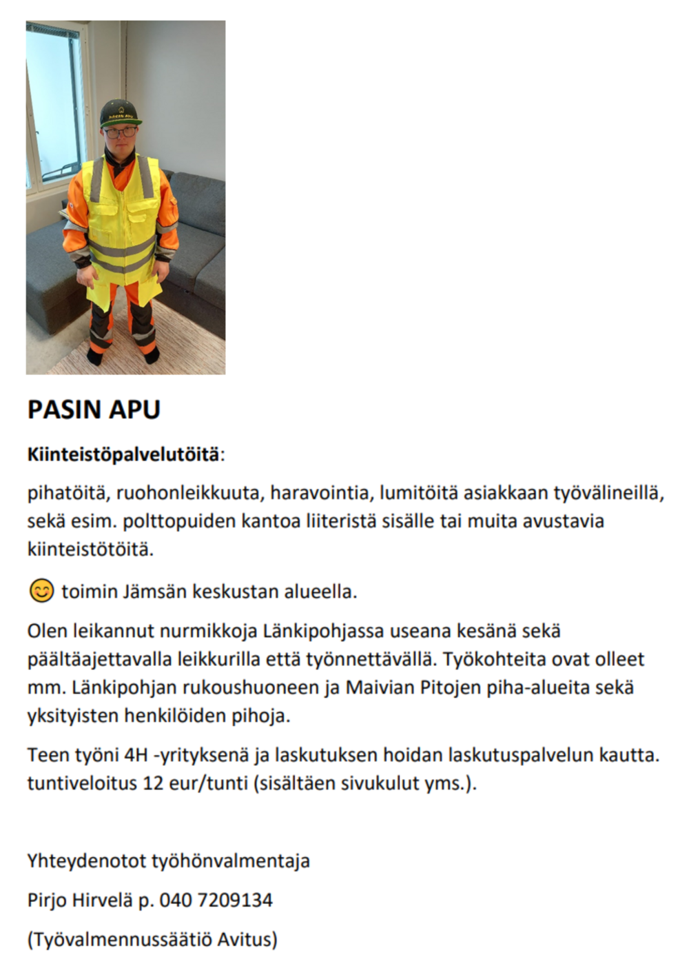 Pihatyö Kaius Kaius Helaste 044 9896469 pihatyöt | Aapelin Apupata Aapeli Tahkola 045 697 9098 pihatyöt, siivous | Valdeko Valde Koskelo 044 921 2982 pihanhoito, vanhusten avustaminen | |