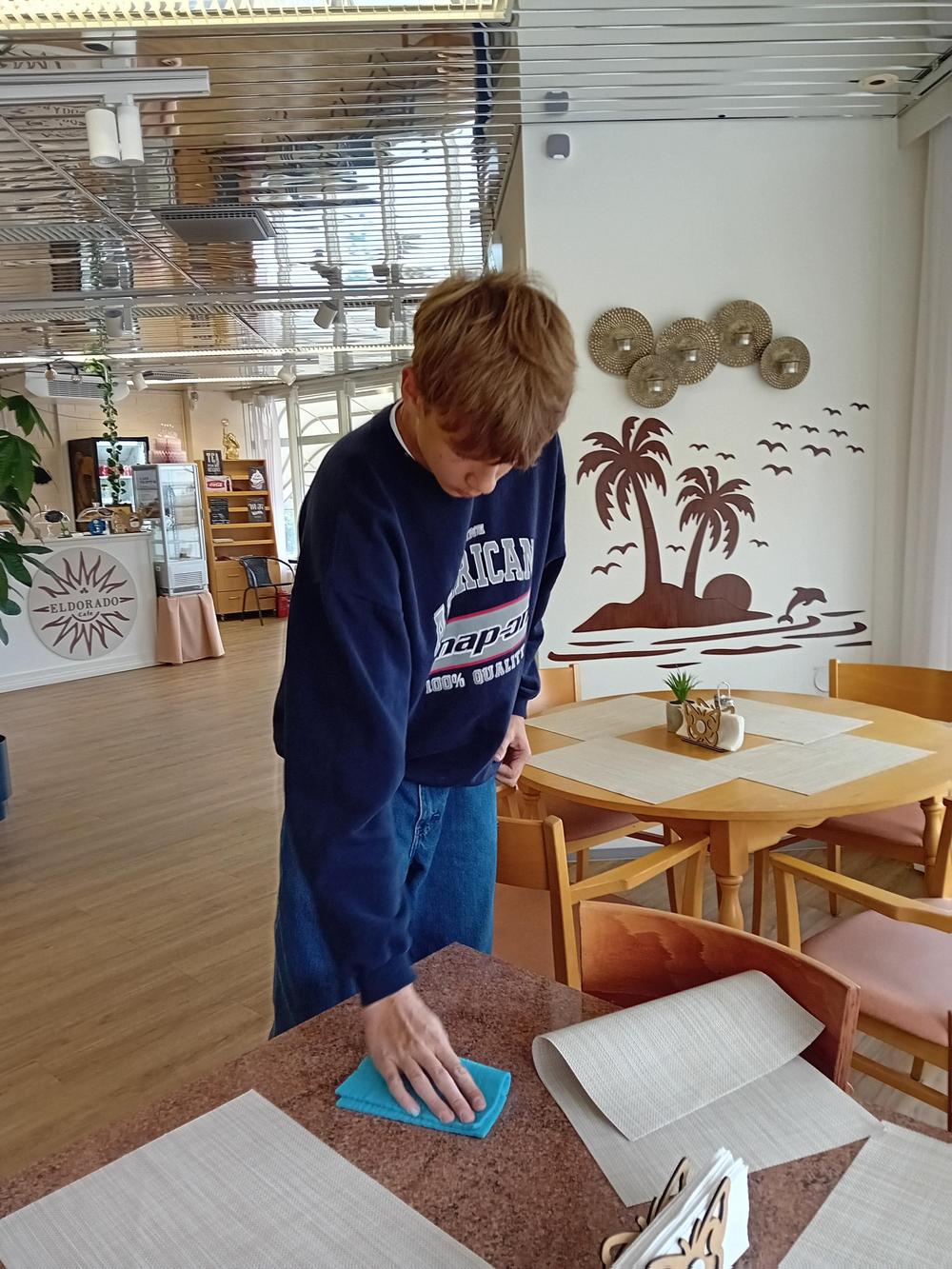 Nuori kertoo, että työ on ollut mukavaa. Työtehtäviin on kuulunut kaupassa käyntiä, tarjoilua ja astioiden korjaamista pöydistä, pöytien ja lattian siivoamista sekä perunan ja porkkanan kuorimista. Nuorelle mieluisin työtehtävä oli ollut kaupassa käynti. Nuoren mielestä kesätyössä parasta on se, että saa olla työpaikalle hyödyksi.