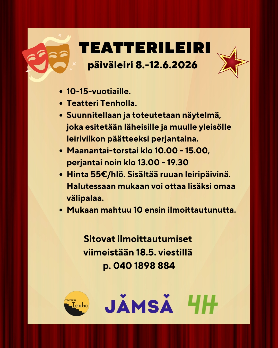 Teatterileirille ilmoittautuminen puh. 040 1898 884.