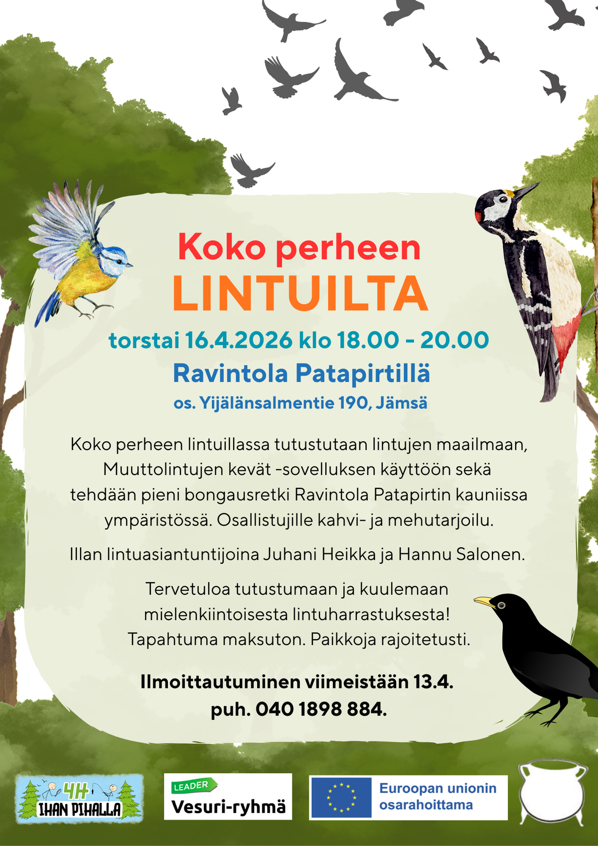 Koko perheelle suunnatussa lintuillassa tutustutaan lintuharrastuksen mielenkiintoiseen maailmaan. Ilmoittaudu mukaan viimeistään 13.4. puhelimitse 040 1898 884.